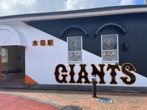 ジャイアンツデザインのJR日南線木花駅(筆者撮影)