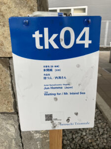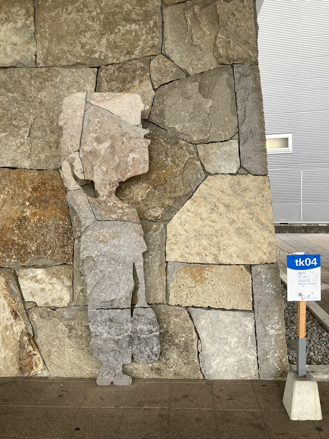 高速バス待合所の外壁に隠れているこの作品は、≪待つ人≫と題されていました。高速バスを待つ人たちに交じって一緒に待っているようなこの作品に心が温かくなりました。作品の横の看板にあるQRコードを読み取ると、作者の情報や作品についての説明を見ることが出来ます。