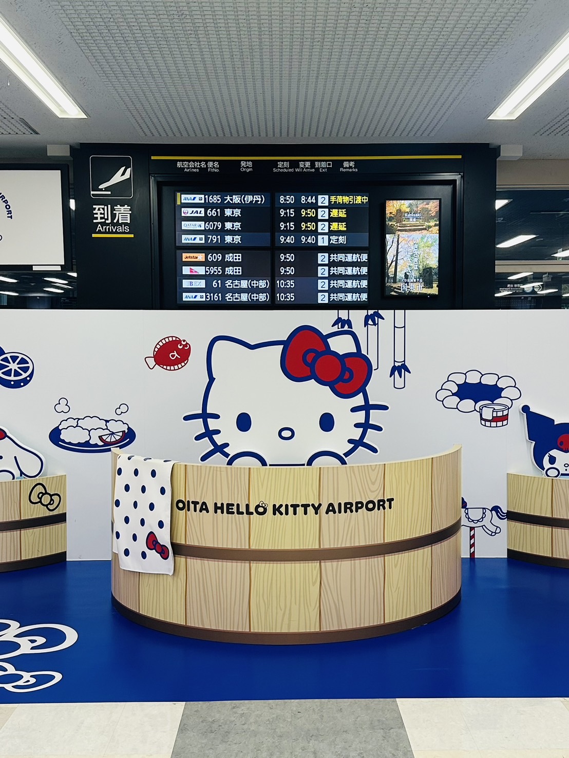 大分空港では、温泉を楽しむハローキティが出迎えてくれます。手荷物と一緒にベルトコンベアでキティのフィギュアが流れ、足湯やトイレの壁にもキャラが彩られていました。