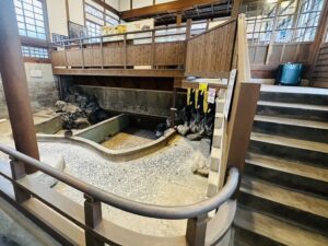 ポンプがなかった時代に浴槽に湯を張るには、地面より下に噴き出し口をつくる必要がありました。そのため、温泉を引く場合も温泉管を少し傾かせて、うまく流れるような作りになっています。