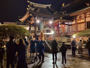 鐘楼堂の前に着くと、焚き火を囲んで暖を取る人たちの姿が目に入ります。寒さをしのぎながら談笑する人々の奥では、鐘をつきに訪れた人が列を作っていました。普段は人影も少なく静かな空気に包まれている境内にこれほど多くが集まっている光景には驚かされました。