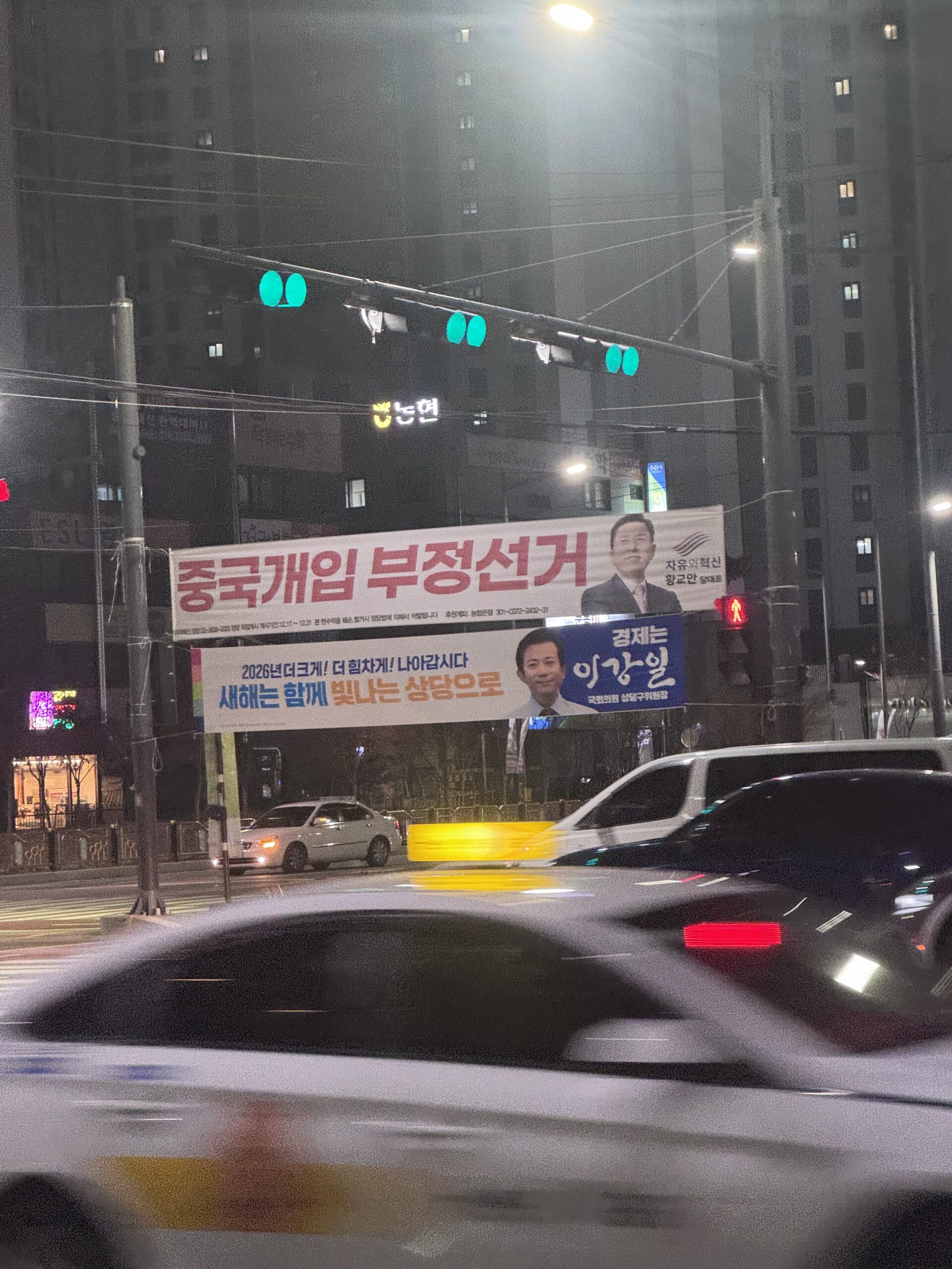 一枚目の垂れ幕には、「中国介入 不正選挙」と大きく書かれていました。もう一枚には、「2026年より大きく!より元気に!進みましょう 新年は共に輝く上党(サンダン)に」と記されており、こちらは筆者の実家がある行政区域である上党区選出の国会議員が掲げたものでした。新年のあいさつとして、地域住民に向けた前向きなメッセージを伝える内容でした。一方で、「中国介入 不正選挙」と書かれた垂れ幕は、「自由と革新」という政党の代表である黄教安(ファン・ギョアン)氏が設置したものでした。