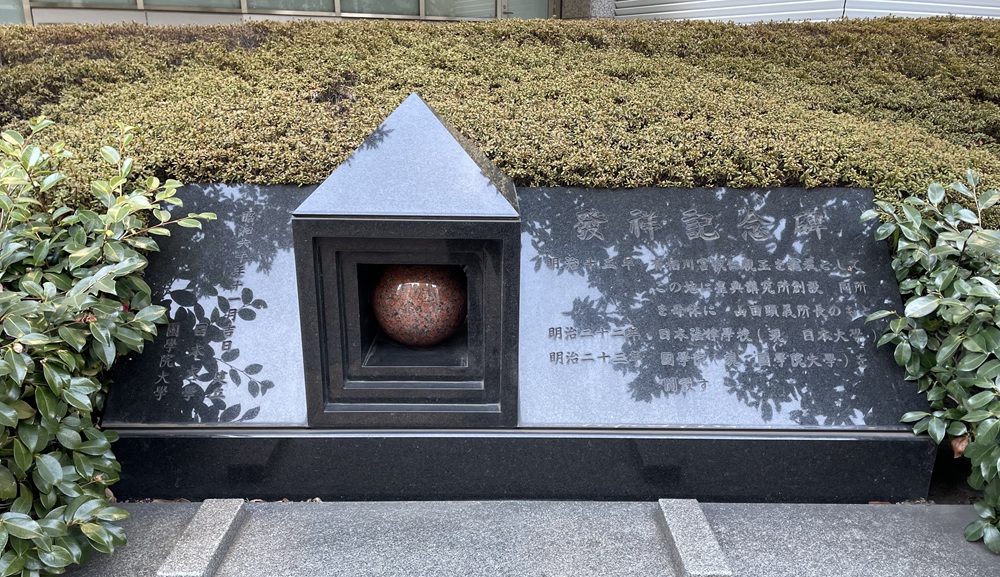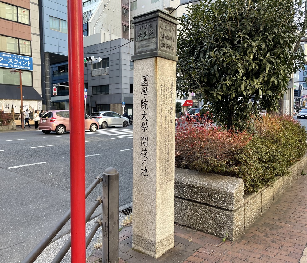 飯田橋に建てられた皇典講究所の発祥記念碑。神道を学ぶ國學院と法律を学ぶ日本大学がかつてこの場所に存在していた。現在は東京区政会館となっている(4日、筆者撮影)