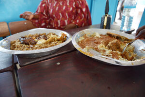 ガンビアではチキンがよく食べられています。他にもジョロフライスという牛肉、野菜などと一緒にお米をいためて塩胡椒、ニンニクで味をつけた料理や、ピーナッツソースを牛肉や豚肉などと一緒に食べるシンディ・ドモダなどが有名です。それぞれ500円ほどでした。ガンビアにコンビニはないようです。現地のスーパーにも行ったところ日本よりも平均して2割ほど高く、現地の人によると、輸入品が多いため値段も割高になってしまうそうです。