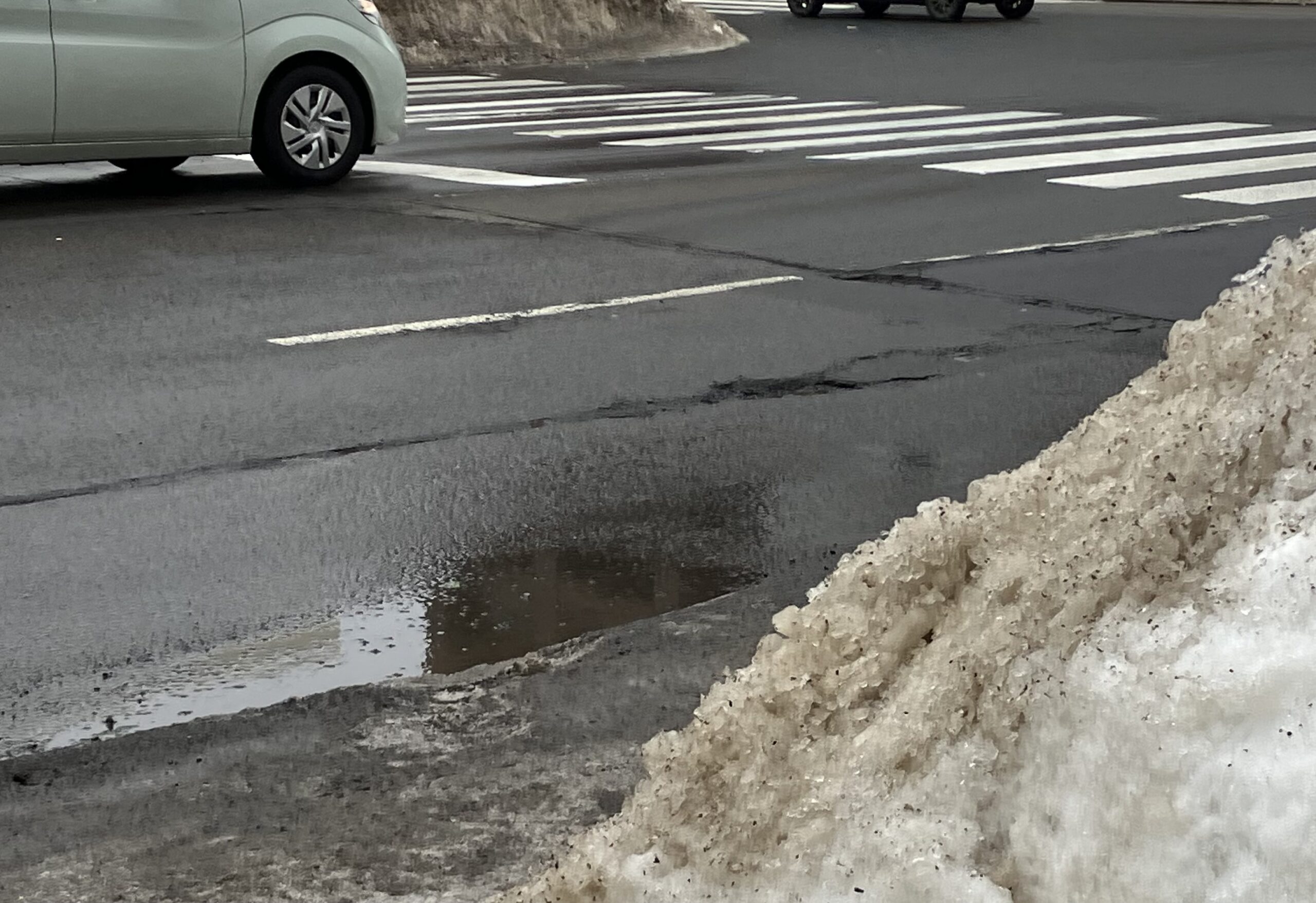融雪期の雪国では、路面にしみ込んだ雪解け水が凍結と融解を繰り返すことで舗装を損傷させ、その上を車が通ることで道路に多数の穴ぼこ(ポットホール)が発生します。