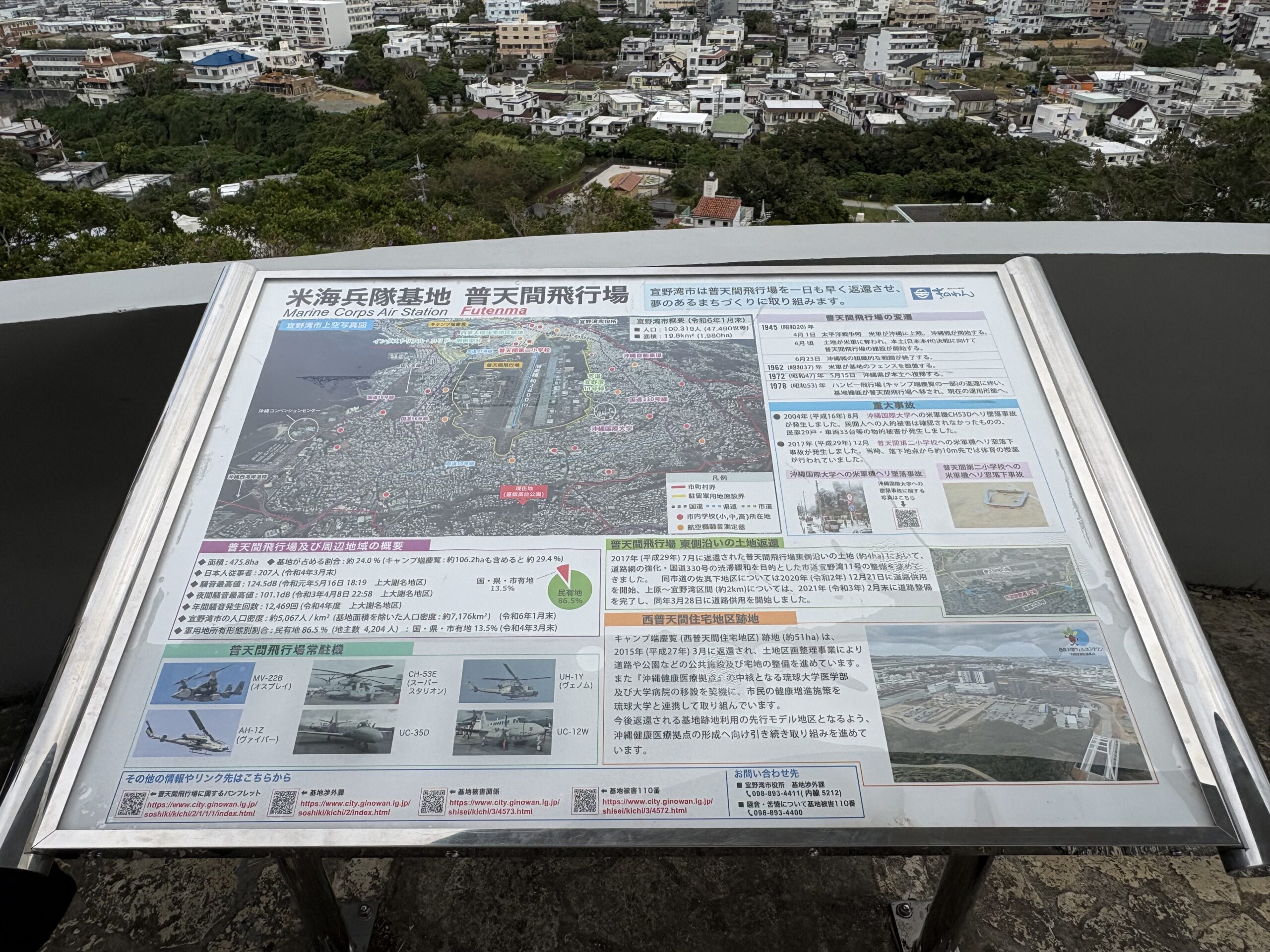 前編で紹介した通り、沖縄では米軍基地をはじめ様々な場所を訪れました。なかでも、宜野湾市の公園にある展望台から一望した普天間飛行場が印象に残っています。「世界一危険」とも言われる通り、飛行場は民家や小学校と隣接しています。2004年8月には、市内にある沖縄国際大学構内に米軍のヘリコプターが墜落する事故も発生しています。事故が起きたことを容易に想像できる飛行場との近さに衝撃を受けました。
