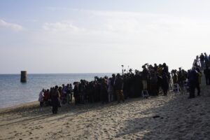 砂浜にはメディアを規制する線が引かれていた。だが、そんなものは全く意味をなさなかった。遺骨をカメラに収めようと押し寄せるメディアの波に押され、本来最優先されるべき遺族たちさえも、肉親の遺骨を見ることができない。「メディアは下がって!遺族を中に入れて!」と誰かが叫ぶと、なんとか遺族は中に入ることができた。