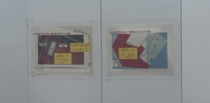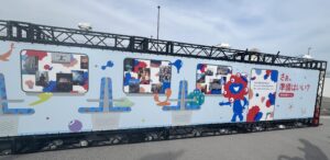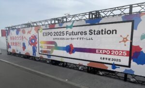 階段を上りきると、駅の案内表示を模した大きな看板がありました。イベント名「EXPO2025 Futures Station」と書かれています。この催しは周辺を「未来のつづきのはじまりの場所」として、駅に見立てた展示で埋められています。車内からの風景のように、大阪万博を写真で振り返る一角、路線図に願い事を書く会場、切符デザインの台紙にミャクミャクの描かれたスタンプを押すコーナーがありました。