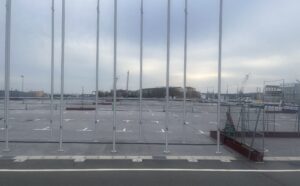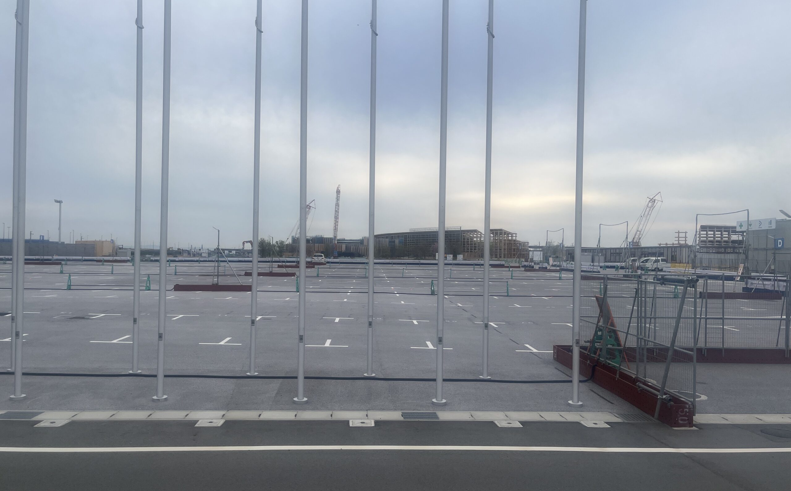 大阪万博の面影は解体途中の大屋根リングだけではありません。ずらりと並んだポールからも感じられます。参加した国や地域などの旗を掲げるために使われ、東ゲートと西ゲートの2箇所で167枚の旗が掲揚されました。旗は降ろされ、ポールのみが直立している無機質な光景にはどこか違和感を覚えます。