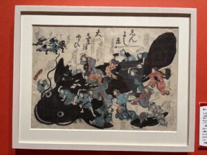 (4月25日筆者撮影 「しんよし原大なまづゆらひ」地震を起こした鯰を懲らしめる人々と、それを止めようとする人々が描かれており、地震で困る人もいれば復興事業で仕事が増えて得をする人もいたという皮肉が込められている)