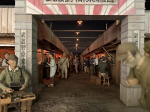 (4月25日筆者撮影 新宿-夜のヤミ市- ヤミ市は終戦直後、空襲で焼け野原となっていた駅前に誕生し、鍋や包丁、・茶碗、・下駄などの生活用品を販売していた。戦後の行政の混乱の中で、ただひとつ活況を呈していた場所であり、都民にとっては生活必需品を入手するための数少ないルートの一つであった)